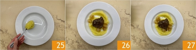 Nun müssen Sie nur noch anrichten: Legen Sie ein paar Esslöffel Püree auf den Boden 25, darauf die Backe und daneben die Borettane-Zwiebeln 26. Beenden Sie mit den frischen Thymianblättern und servieren Sie sofort 27.