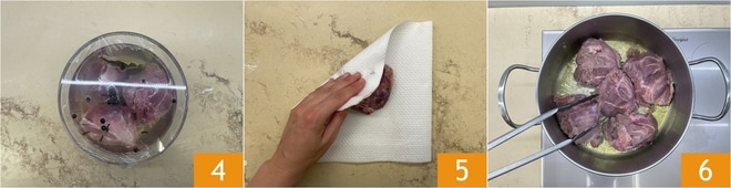 Bedecken Sie es mit Frischhaltefolie 4 und lassen Sie es mindestens 1 Stunde im Kühlschrank marinieren. Nach der notwendigen Zeit entnehmen Sie das Fleisch aus der Marinade, ohne sie wegzuwerfen, und trocknen Sie die Backen sehr gut mit Küchenpapier 5. Erhitzen Sie einen Schuss Öl in einem großen Topf und legen Sie die Backen hinein 6.