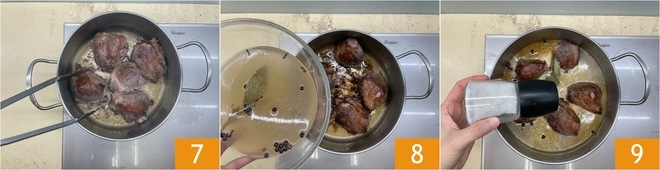Braten Sie sie gut auf allen Seiten an, indem Sie sie mit einer Zange wenden 7. Wenn sie gut gebräunt sind, gießen Sie die Marinade mit den Gewürzen hinzu 8 und würzen Sie mit Salz 9.