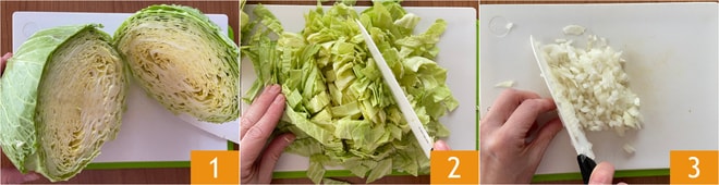 Um die Verze sofegae vorzubereiten, reinigen Sie den Wirsing, indem Sie die äußeren, verschlisseneren Blätter entfernen, sodass Sie etwa 700 g erhalten. Waschen Sie ihn gut unter fließendem Wasser, schneiden Sie ihn dann mit einem scharfen Messer zunächst in zwei Hälften 1 und anschließend fein 2, und lassen Sie den härteren Mittelteil aus, der entfernt werden muss. Schälen und hacken Sie die Zwiebel fein 3.