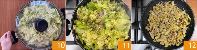 Gießen Sie das Öl in eine große Pfanne, fügen Sie die gehackte Zwiebel und die Knoblauchzehe hinzu 7 und braten Sie gut an. Geben Sie dann die zerbröckelten Würstchen und den in Streifen geschnittenen Wirsing hinzu, fügen Sie den Rosmarinzweig hinzu, und würzen Sie mit Salz und Pfeffer 9.