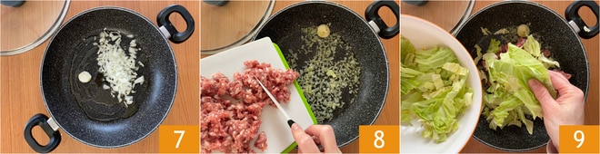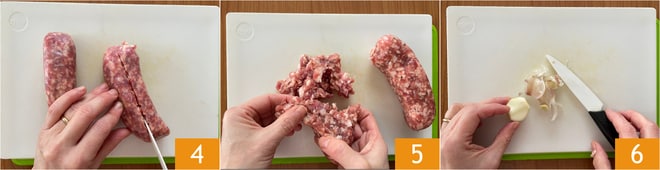 Entfernen Sie die Haut von den Würstchen 4 und zerbröckeln Sie sie mit den Händen 5. Schälen Sie auch die Knoblauchzehe 6.