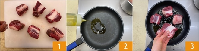 Um das geschmorte Bruststück mit Püree zuzubereiten, beginnen Sie mit dem Fleisch, das eine lange Garzeit benötigt: Salzen Sie das bereits in Stücke geschnittene Bruststück 1. Erhitzen Sie etwas Olivenöl in einer Pfanne 2 und legen Sie dann die Fleischstücke hinein 3.