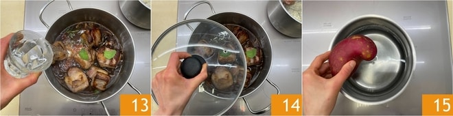 Gießen Sie ein Glas Wasser hinzu 13, decken Sie es mit einem Deckel ab 14 und lassen Sie es anderthalb Stunden bei niedriger Hitze köcheln, gelegentlich umrühren. In der Zwischenzeit die Kartoffeln in kochendem Wasser etwa 30-40 Minuten kochen, oder bis sie weich sind 15.
