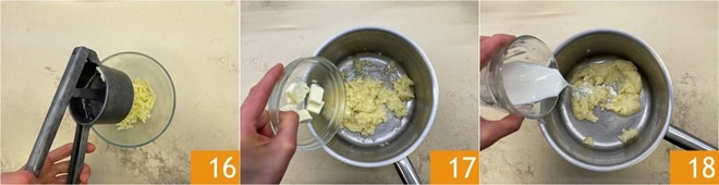 Drücken Sie die heißen Kartoffeln mit der Schale durch eine Kartoffelpresse 16, dann die Püree in einen Topf mit Butter 17 und heißer Milch geben 18.
