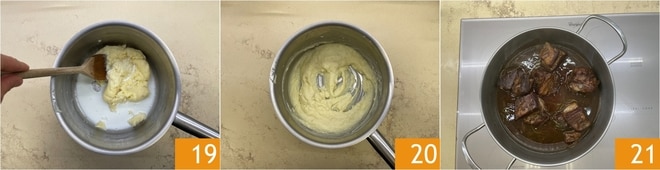 Salzen und mit einem Löffel umrühren 19, um ein gleichmäßiges und cremiges Püree zu erhalten 20. In der Zwischenzeit wird auch das Fleisch gar sein 21.