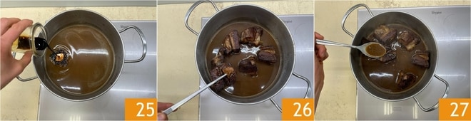 Stellen Sie den Bratensaft wieder auf die Hitze, gießen Sie weitere 10 ml Balsamico-Essig hinzu 25, fügen Sie das beiseite gelegte Fleisch hinzu 26 und lassen Sie die Soße einreduzieren, bis sie dick ist 27. Korrigieren Sie gegebenenfalls mit Salz.