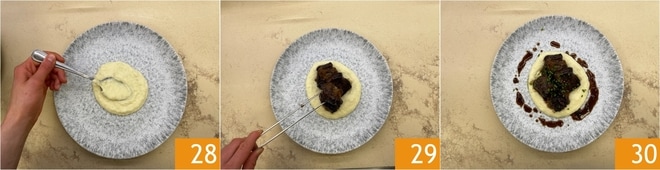 Servieren Sie auf Tellern mit einem Bett aus Kartoffelpüree 28, auf das Sie die Fleischstücke legen 29. Vervollständigen Sie das Gericht, indem Sie den Bratensaft darüber verteilen und frischen, gehackten Schnittlauch hinzufügen. Das geschmorte Bruststück mit Püree ist bereit zum Servieren 30!