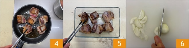 Braten Sie es bei starker Hitze an 4, nehmen Sie dann das Bruststück aus der Pfanne und legen Sie es beiseite in eine Auflaufform 5. Schälen und schneiden Sie die Zwiebel in Scheiben 6.