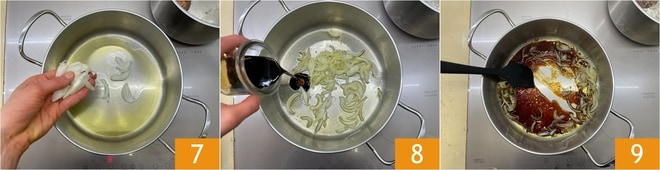 Erhitzen Sie in einem Schmortopf einen weiteren Schuss Öl, fügen Sie die Zwiebel hinzu 7 und lassen Sie sie 3 Minuten bei niedriger Hitze dünsten, dann mit 40 ml Balsamico-Essig ablöschen 8. Rühren, um den Geschmack zu entfalten 9.