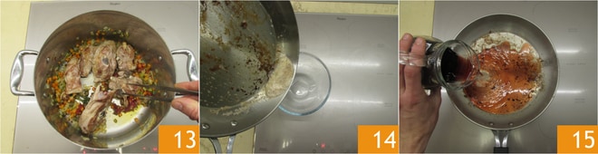 Wenn es eine schöne Farbe hat, geben Sie die Lammstücke in den Topf mit dem Gemüse 13. Entfernen Sie das Fett aus der Pfanne, in der Sie das Fleisch angebraten haben 14, und gießen Sie den Rotwein in dieselbe Pfanne 15, achten Sie darauf, den Bratensatz gut von der Pfanne zu lösen.