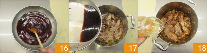 Wenn der Alkohol gut verdampft ist und sich um 1/3 reduziert hat 16, gießen Sie ihn in den Topf mit dem Fleisch 17. Stellen Sie den Topf wieder auf den Herd und fügen Sie die Fleischbrühe hinzu 18.