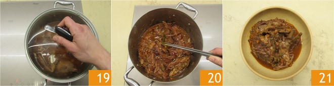 Kochen Sie weiter bei sehr schwacher Hitze mit Deckel 19 für eine Stunde und dann für eine weitere halbe Stunde ohne Deckel, damit die Flüssigkeit verdampft und die Sauce dick wird 20. An diesem Punkt ist das geschmorte Lamm servierbereit, servieren Sie es heiß 21.