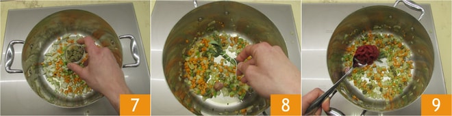 Nach ein paar Minuten geben Sie die entsalzten Kapern hinzu 7 und braten alles bei schwacher Hitze für einige Minuten weiter. Fügen Sie auch das Kräuterbündel hinzu 8. Schließlich geben Sie das Tomatenmark hinzu 9, rühren ein paar Minuten um und stellen es beiseite, dies wird die Basis für die Schmorflüssigkeit sein.