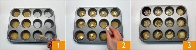 Um die gestürzten Pfirsichtörtchen vorzubereiten, fetten Sie eine 12-Muffin-Form ein. Geben Sie den braunen Zucker 1 und die Butter in Würfeln 2 hinein. Stellen Sie dann die Form auf den Boden des Ofens und lassen Sie sie bei 180° einige Minuten backen, bis Sie das Karamell erhalten 3. Lassen Sie es abkühlen.