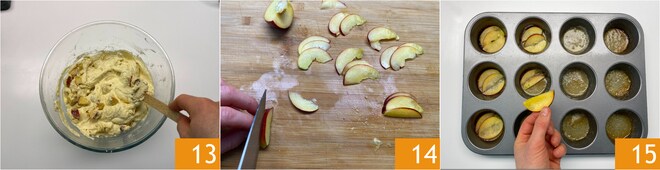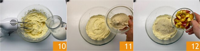 Schließlich gießen Sie die Milch in einem dünnen Strahl hinzu 10. Schalten Sie den Mixer aus und fügen Sie vorsichtig das Mandelmehl 11 und die Pfirsichwürfel 12 hinzu.