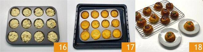 Geben Sie die Masse in die Form 16 und backen Sie sie im statischen Ofen bei 180° etwa 30 Minuten lang 17. Führen Sie das Rücken eines Messers in die Räume, während die Form noch heiß ist, und stürzen Sie sie mit Hilfe eines Rosts. Geben Sie einige kräftige Schläge, um sie zu lösen. Vor dem Servieren mit ein paar Minzblättern garnieren 18.