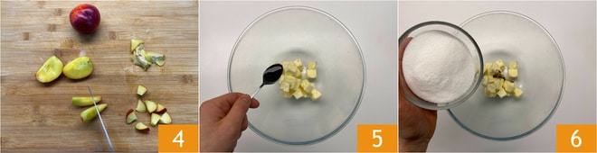 In der Zwischenzeit schneiden Sie 2 Pfirsiche in Würfel 4. Geben Sie in eine Schüssel die Butter, den Vanilleextrakt 5 und den Zucker 6.