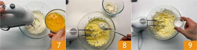 Schlagen Sie mit dem Handmixer einige Minuten. Fügen Sie nach und nach die Eier zu der hellen und schaumigen Mischung hinzu 7. Erhalten Sie eine noch luftigerer Masse und integrieren Sie dann das gesiebte Mehl 8 und Backpulver 9.