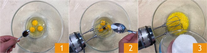 Um den umgedrehten Pfirsichkuchen zuzubereiten, bereiten Sie zuerst den Teig vor: Lassen Sie die Butter in einem Topf schmelzen und abkühlen. In einer großen Schüssel die Eier, das Vanilleextrakt 1 und das Salz 2 hinzufügen. Beginnen Sie mit einem elektrischen Handrührgerät zu schlagen und geben Sie dann den Zucker hinzu 3. Arbeiten Sie weiter, bis die Mischung schaumig ist.