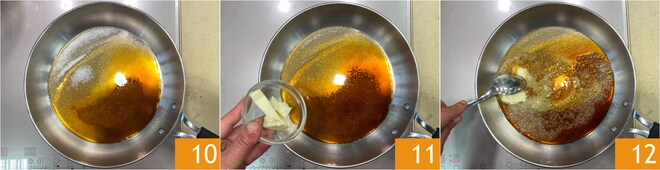 Für die Zubereitung des Karamells geben Sie den Zucker in eine Pfanne mit dickem Boden und lassen ihn bei sehr niedriger Hitze schmelzen, ohne ihn zu berühren 10. Sobald er eine schöne bernsteinfarbene Farbe erreicht hat, fügen Sie die Butter hinzu 11 und rühren mit einem Löffel um 12.