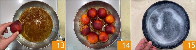 Legen Sie die Pfirsiche in die Pfanne, sodass die Schnittfläche mit dem Karamell in Kontakt ist 13 und lassen Sie sie eine Minute lang so, dann schalten Sie die Hitze aus 14. In der Zwischenzeit buttern und zuckern Sie eine Springform mit einem Durchmesser von 21,5 cm am Boden und 24 cm an der Oberfläche 15.