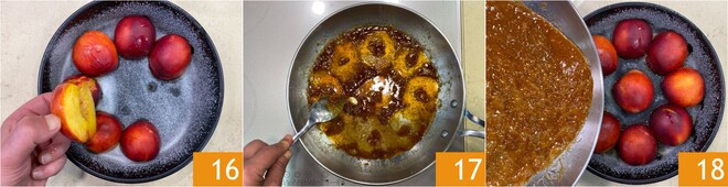 Nehmen Sie die Pfirsiche aus der Pfanne und legen Sie sie in die Springform, mit der Schnittfläche nach unten 16. Mischen Sie das restliche Karamell in der Pfanne 17 und gießen Sie es über die Pfirsiche 18.