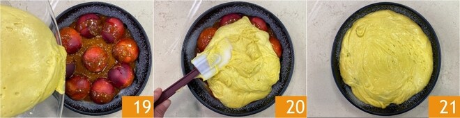 Zum Schluss geben Sie auch den Teig hinzu 19 und glätten die Oberfläche mit einem Spatel 20. Backen Sie den Kuchen im vorgeheizten statischen Ofen bei 175° für 45 Minuten 21.