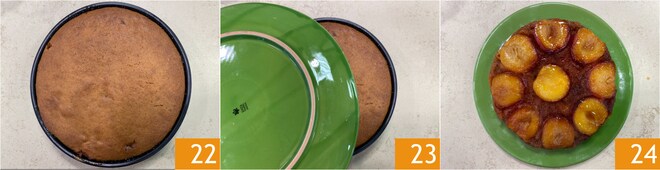 Prüfen Sie nach dieser Zeit die Garstufe mit einem Zahnstocher und nehmen Sie den Kuchen aus dem Ofen 22. Stürzen Sie ihn sofort auf einen Servierteller, achten Sie darauf, sich nicht zu verbrennen 23. Lassen Sie ihn abkühlen und servieren Sie Ihren köstlichen umgedrehten Pfirsichkuchen, eventuell begleitet von einer Kugel Sahneeis 24!