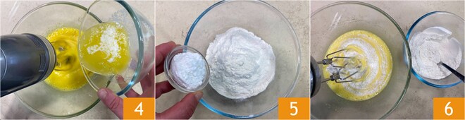 Gießen Sie nun die abgekühlte geschmolzene Butter langsam ein, während das Rührgerät weiterläuft 4. Mischen Sie das Mehl und das Backpulver in einer separaten Schüssel 5 und geben Sie dann nach und nach die trockenen Zutaten zur Mischung 6.