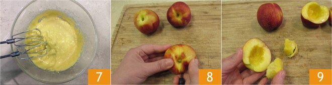 Arbeiten Sie weiter, bis ein glatter und homogener Teig entsteht 7. Legen Sie ihn beiseite und kümmern Sie sich um die Pfirsiche: Waschen Sie sie und teilen Sie sie in Hälften 8, entfernen Sie dann den Kern 9.