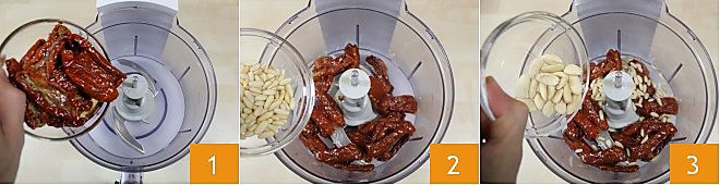 Um das Pesto aus getrockneten Tomaten zuzubereiten, geben Sie die getrockneten Tomaten mit dem Öl, in dem sie eingelegt sind, in den Mixer 1, fügen Sie die Pinienkerne 2 und die geschälten Mandeln hinzu 3.