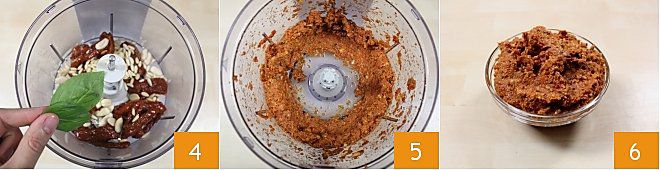 Fügen Sie die Basilikumblätter hinzu 4 und mixen Sie, bis Sie eine ziemlich grobe Mischung erhalten 5. An diesem Punkt ist Ihr Pesto aus getrockneten Tomaten bereit, als schmackhaftes Gewürz verwendet zu werden 6!