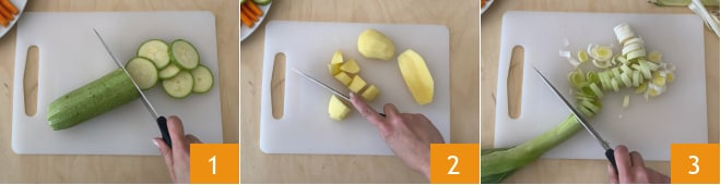 Um das gewürzte geschmorte Gemüse zuzubereiten, schneiden Sie die gewaschene Zucchini in Scheiben 1. Schälen Sie die Kartoffel, waschen Sie sie und schneiden Sie sie in Würfel 2. Schälen Sie die Karotten und schneiden Sie sie in Stifte. Schälen und schneiden Sie den Lauch 3, geben Sie ihn in ein Sieb, waschen Sie ihn und lassen Sie ihn gut abtropfen.