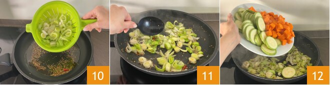 Reduzieren Sie die Hitze der Pfanne mit den Gewürzen und fügen Sie den Lauch hinzu 10. Rühren Sie um 11 und lassen Sie ihn einige Minuten anbraten. Jetzt fügen Sie die Zucchini und den Kürbis hinzu 12, rühren Sie erneut um und lassen Sie es noch einige Minuten kochen.