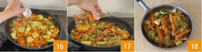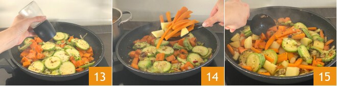 Salzen Sie das Gemüse 13, dann nehmen Sie mit einem Schaumlöffel die Kartoffeln und Karotten heraus und geben Sie sie nach und nach zu dem restlichen Gemüse in die Pfanne 14, vorsichtig umrühren 15.