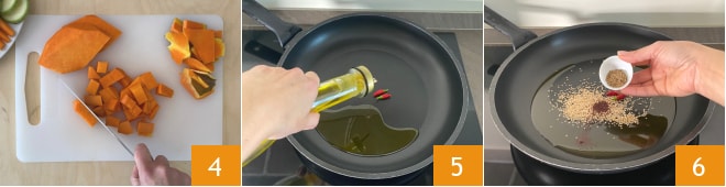 Schälen Sie den Kürbis und schneiden Sie ihn in grobe Würfel 4. In einer großen Pfanne erhitzen Sie das Öl, fügen die Chilischoten 5 und die Gewürze 6 hinzu.