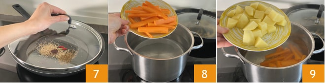 Decken Sie die Pfanne ab und braten Sie einige Minuten an 7. In der Zwischenzeit bringen Sie etwas gesalzenes Wasser zum Kochen. Geben Sie die Karotten 8 und die Kartoffeln 9 in das kochende Wasser und lassen Sie sie 10 Minuten kochen.