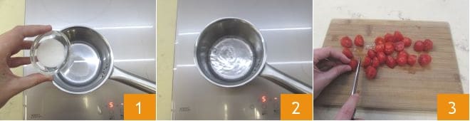 Um die pikanten Eislutscher vorzubereiten, bereiten Sie zuerst den Sirup vor, der für beide Geschmacksrichtungen benötigt wird. Geben Sie Wasser und Zucker 1 in einen kleinen Topf und bringen Sie es zum Kochen 2. Nehmen Sie es sofort vom Herd und lassen Sie es abkühlen. Gehen Sie zum ersten der beiden Geschmacksrichtungen über: Waschen Sie die Kirschtomaten und halbieren Sie sie 3.