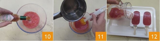 Fügen Sie auch den Tabasco 10 und 50 g des zuvor zubereiteten Sirups in einem dünnen Strahl hinzu 11, während Sie ständig rühren. Zur Vereinfachung gießen Sie die Mischung in einen kleinen Krug und verteilen Sie sie auf 2 Eislutscherformen mit einem Fassungsvermögen von 70 cl, in die Sie zuvor die passenden Stäbchen eingesetzt haben 12.