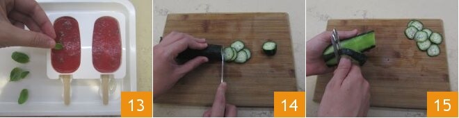Verteilen Sie nun die Basilikumblätter in den Formen, indem Sie sie gut in die Mischung eindrücken 13. Stellen Sie Ihre Datteltomaten-Eislutscher in den Gefrierschrank, wo sie mindestens 6 Stunden bleiben sollten. Gehen Sie dann zum zweiten Typ von Eislutschern über. Schneiden Sie 4 dünne Gurkenscheiben und stellen Sie sie beiseite (sie werden für die Dekoration benötigt) 14, schälen Sie den Rest 15.