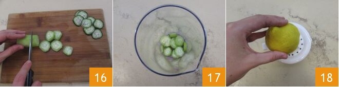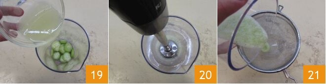 den Sie zum Gurkenfruchtfleisch hinzufügen 19 und pürieren Sie, um ein Püree zu erhalten 20. Filtern Sie es durch ein feines Sieb 21.