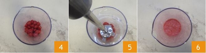 Geben Sie sie in einen Mixerbehälter 4 und pürieren Sie sie mit dem Stabmixer 5 zu einem Püree 6.