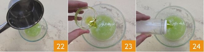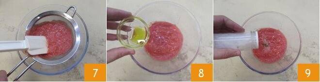 Filtern Sie es durch ein feines Sieb, um die Samen zu entfernen 7. Fügen Sie dann das Olivenöl extra vergine 8 und eine Prise Salz hinzu 9.