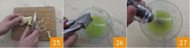 Reinigen Sie den Ingwer 25 und schneiden Sie ihn in stückchengroße Stücke, damit Sie ihn mit der Knoblauchpresse auspressen können 26, um einen Saft zu erhalten, den Sie der Mischung hinzufügen. Würzen Sie schließlich mit Pfeffer 27 und mischen Sie alles gut durch.