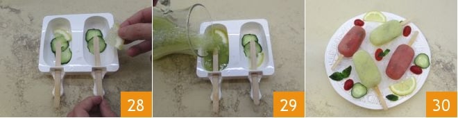 Positionieren Sie die Gurken- und Zitronenscheiben in den Eislutscherformen 28. Gießen Sie die Gurken-, Ingwer- und Zitronenpüree, auch hier zur Vereinfachung in einen Krug gegeben, in die Formen 29 und stellen Sie sie mindestens 6 Stunden in den Gefrierschrank. Nach der Gefrierzeit entformen Sie Ihre pikanten Eislutscher 30 und genießen Sie sie sofort!