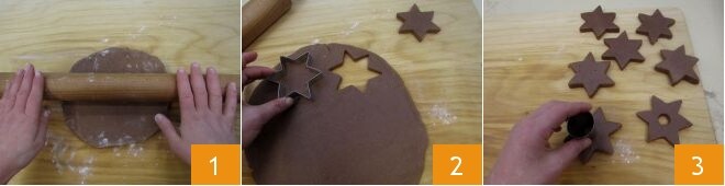Nehmen Sie den Kakao-Haselnuss-Mürbeteig und rollen Sie ihn auf einer leicht bemehlten Arbeitsfläche zu einer Scheibe von etwa 1 cm Dicke aus 1; mit einer Ausstechform von 8 cm stechen Sie 20 Sternchen aus (Sie können auch die Teigabschnitte wiederverwenden, indem Sie den Mürbeteig erneut kneten und ausrollen) 2, dann machen Sie ein kleines Loch in der Mitte, indem Sie die Sternchen mit einem Ausstecher von etwa 2 cm Durchmesser ausstechen 3.