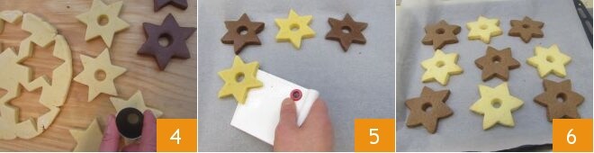 Machen Sie dieselben Schritte auch für den hellen Mürbeteig: Stechen Sie 20 Sternchen aus und stechen Sie die Mitte aus 4, platzieren Sie sie dann leicht auseinander auf mit Backpapier ausgelegten Backblechen 5 und stellen Sie sie für etwa 15 Minuten in den Kühlschrank, damit sie beim Backen ihre Form behalten. Backen Sie im vorgeheizten statischen Ofen bei 170°C für etwa 15 Minuten (150°C für etwa 8-10 Minuten, in diesem Fall können Sie zuerst eine kleine Menge backen, um die ideale Zeit und Temperatur für Ihren Ofen zu ermitteln). Sobald sie gebacken sind, nehmen Sie die Sternchen aus dem Ofen 6 und lassen Sie sie vollständig auf einem Kuchengitter abkühlen.