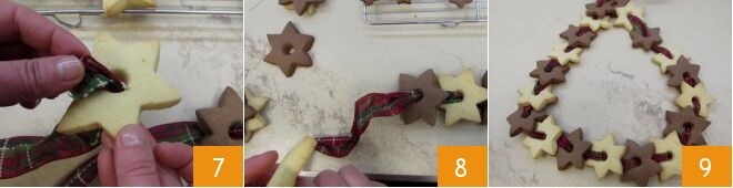 Dann nehmen Sie ein Band mit einem Muster Ihrer Wahl und fädeln es durch die Löcher 7, indem Sie einen hellen und einen Kakaostern abwechseln 8. Mit diesen Mengen können Sie zwei Kränze aus jeweils 20 Sternchen herstellen 9!