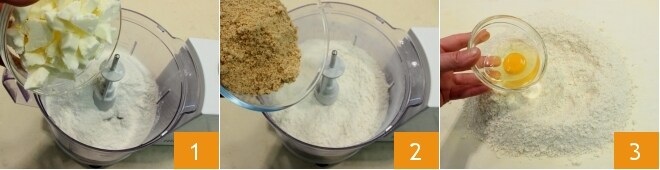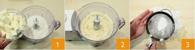 Um den hellen Mürbeteig vorzubereiten, beginnen Sie damit, die kalte Butter in Stückchen und das Mehl in die Schüssel des Mixers zu geben 1 und führen Sie die Krümelbildung durch, indem Sie die Klingen intermittierend betätigen, um die Zutaten nicht übermäßig zu erhitzen 2. Kippen Sie die Krümelbildung auf die Arbeitsfläche und fügen Sie den gesiebten Puderzucker hinzu 3,